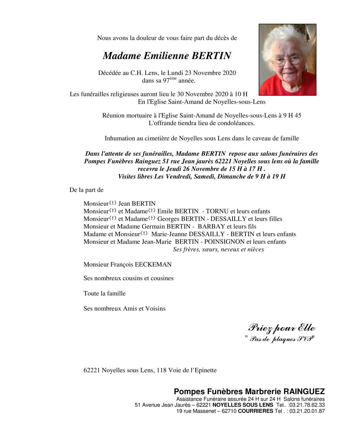 Décédée à Lens (62300, France) le lundi 23 novembre 2020 à l'âge de 96 ans