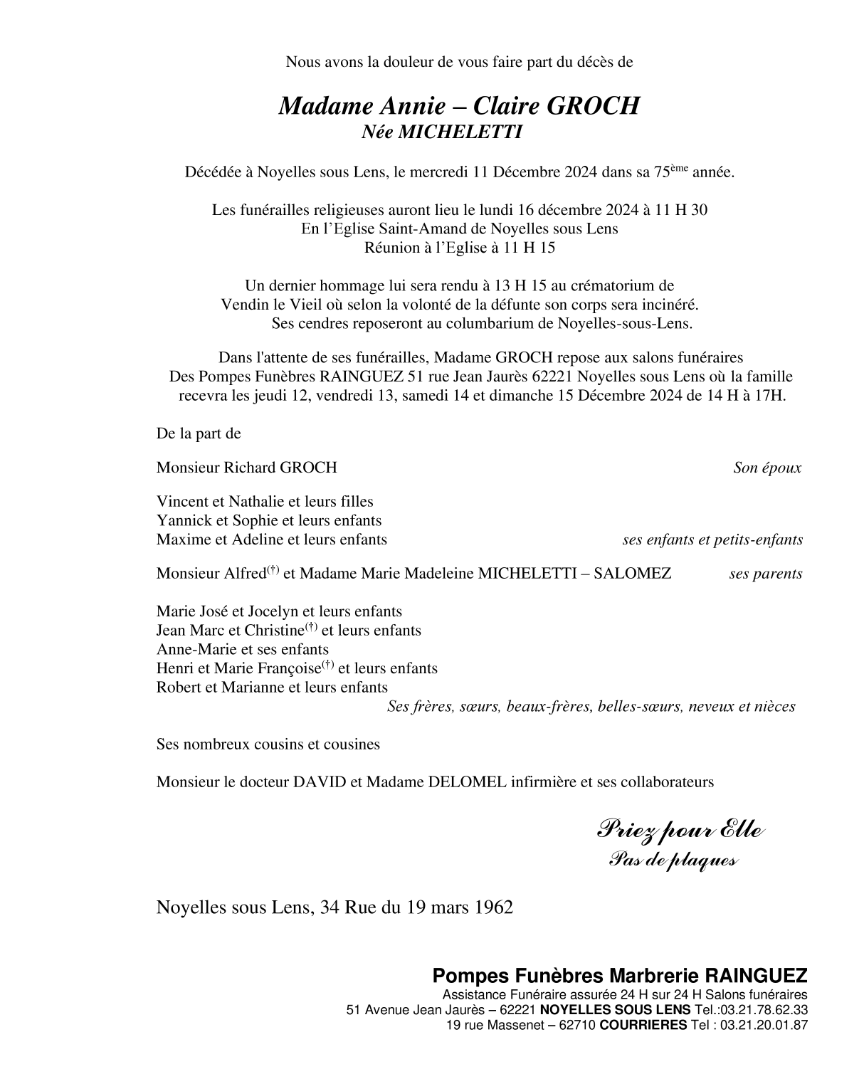 Décédée à Noyelles-sous-Lens (62221, France) le mercredi 11 décembre 2024 à l'âge de 74 ans