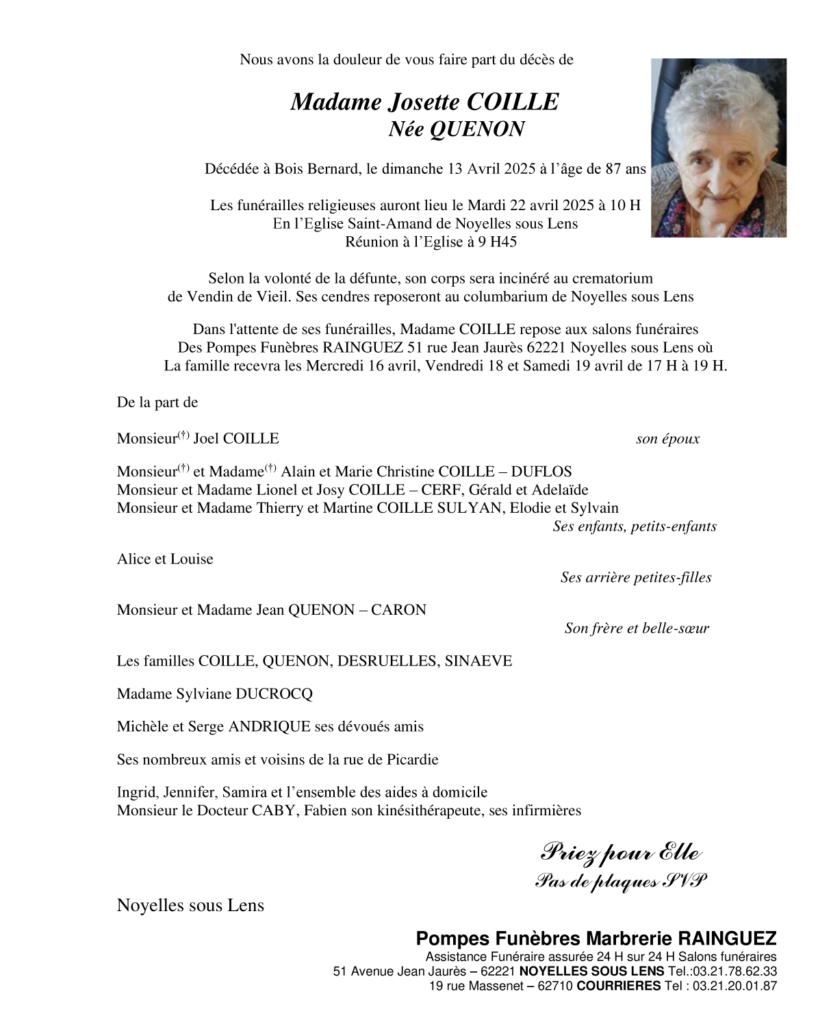 Décédée à Bois-Bernard (62320, France) le dimanche 13 avril 2025 à l'âge de 87 ans