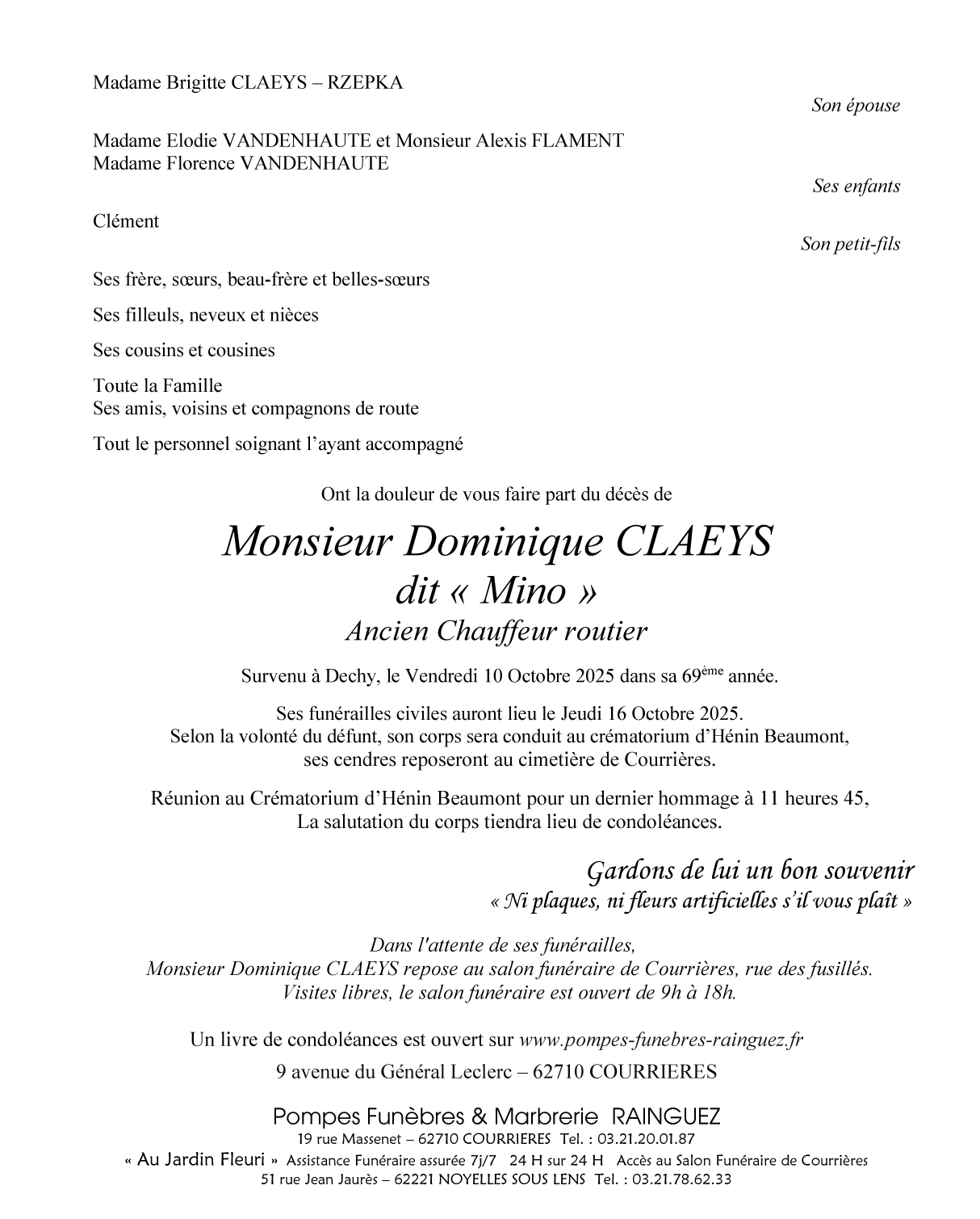 Décédé à Dechy (59187, France) le vendredi 10 octobre 2025 à l'âge de 69 ans