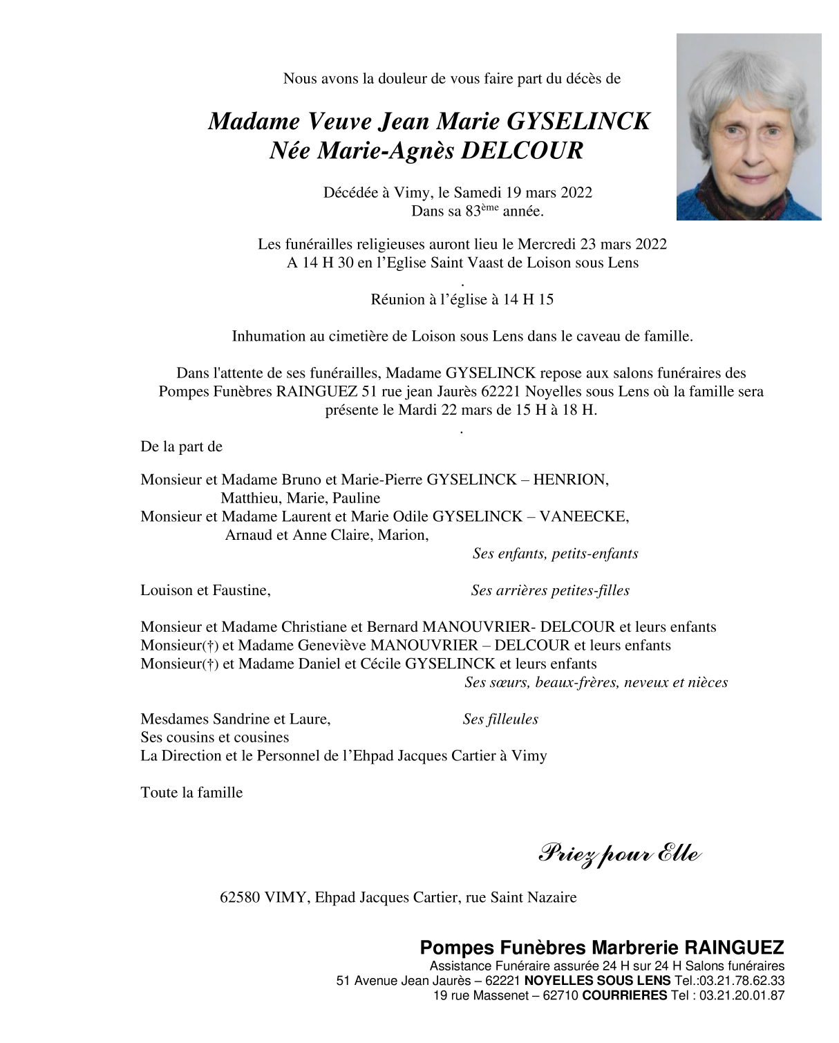 Décédée à Vimy (62580, France) le samedi 19 mars 2022 à l'âge de 82 ans