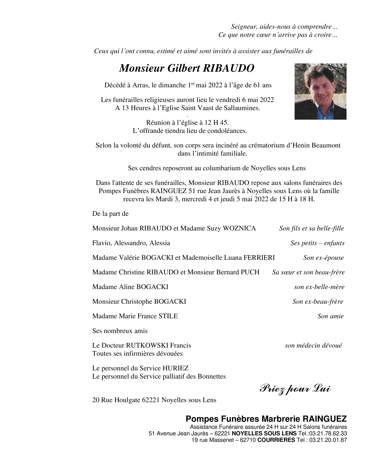 Décédé à Arras (62000, France) le dimanche 1 mai 2022 à l'âge de 61 ans