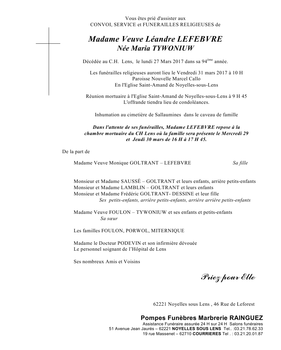 Décédée à Lens (62300, France) le lundi 27 mars 2017 à l'âge de 93 ans