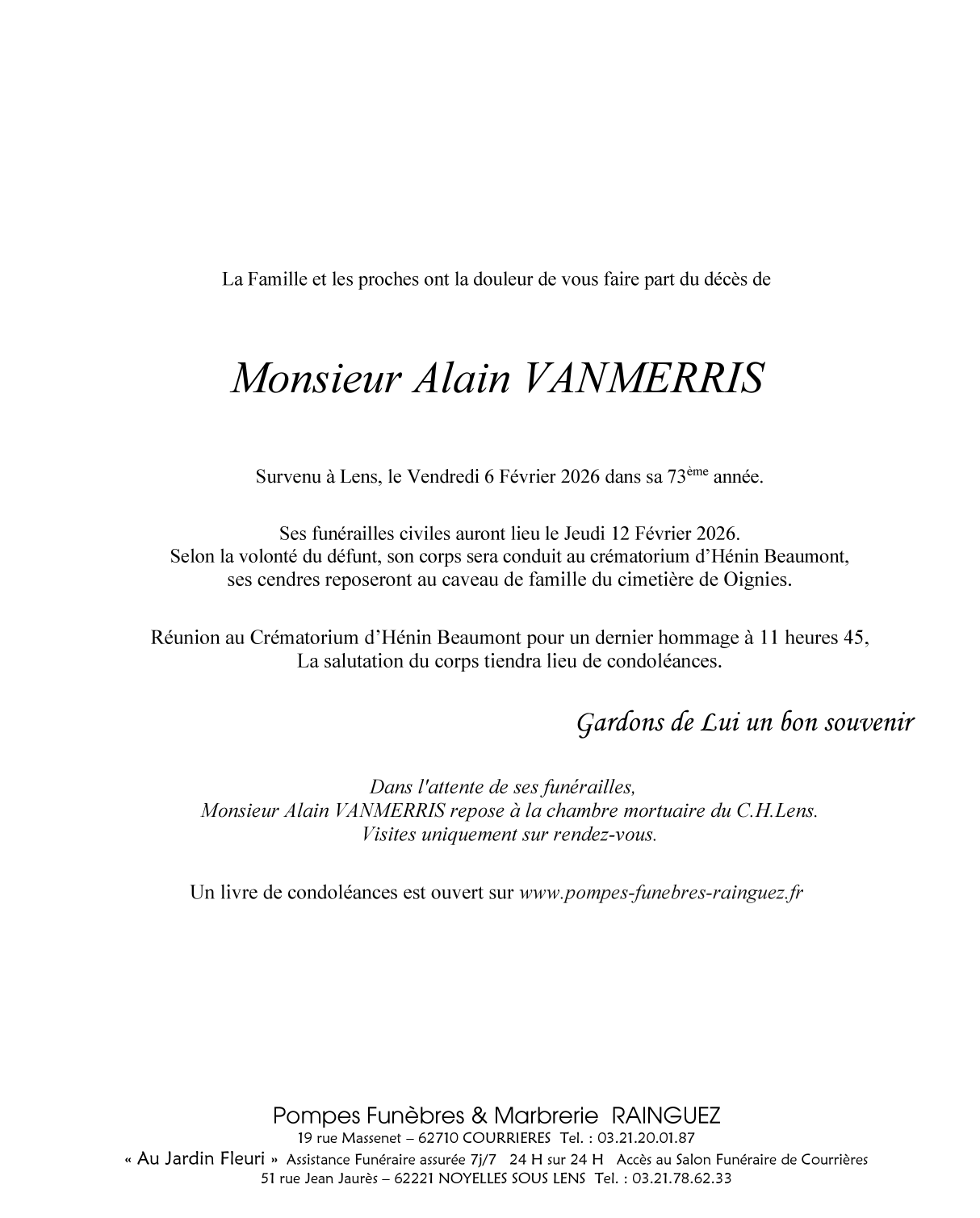Décédé à Lens (62300, France) le vendredi 6 février 2026 à l'âge de 72 ans