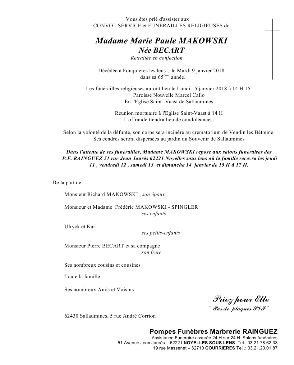 Décédée à Fouquières-lès-Lens (62740, France) le mardi 9 janvier 2018 à l'âge de 64 ans