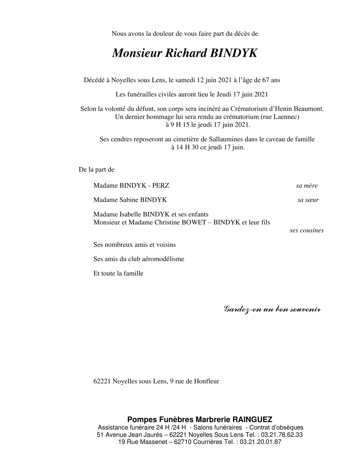 Décédé à Noyelles-sous-Lens (62221, France) le samedi 12 juin 2021 à l'âge de 67 ans