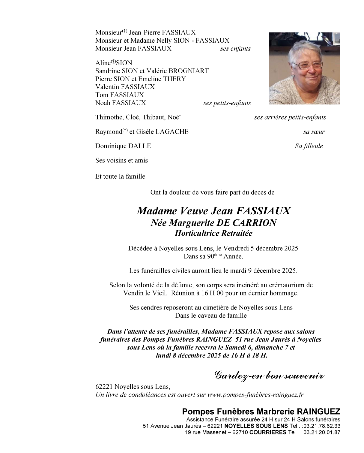 Décédée à Noyelles-sous-Lens (62221, France) le vendredi 5 décembre 2025 à l'âge de 89 ans