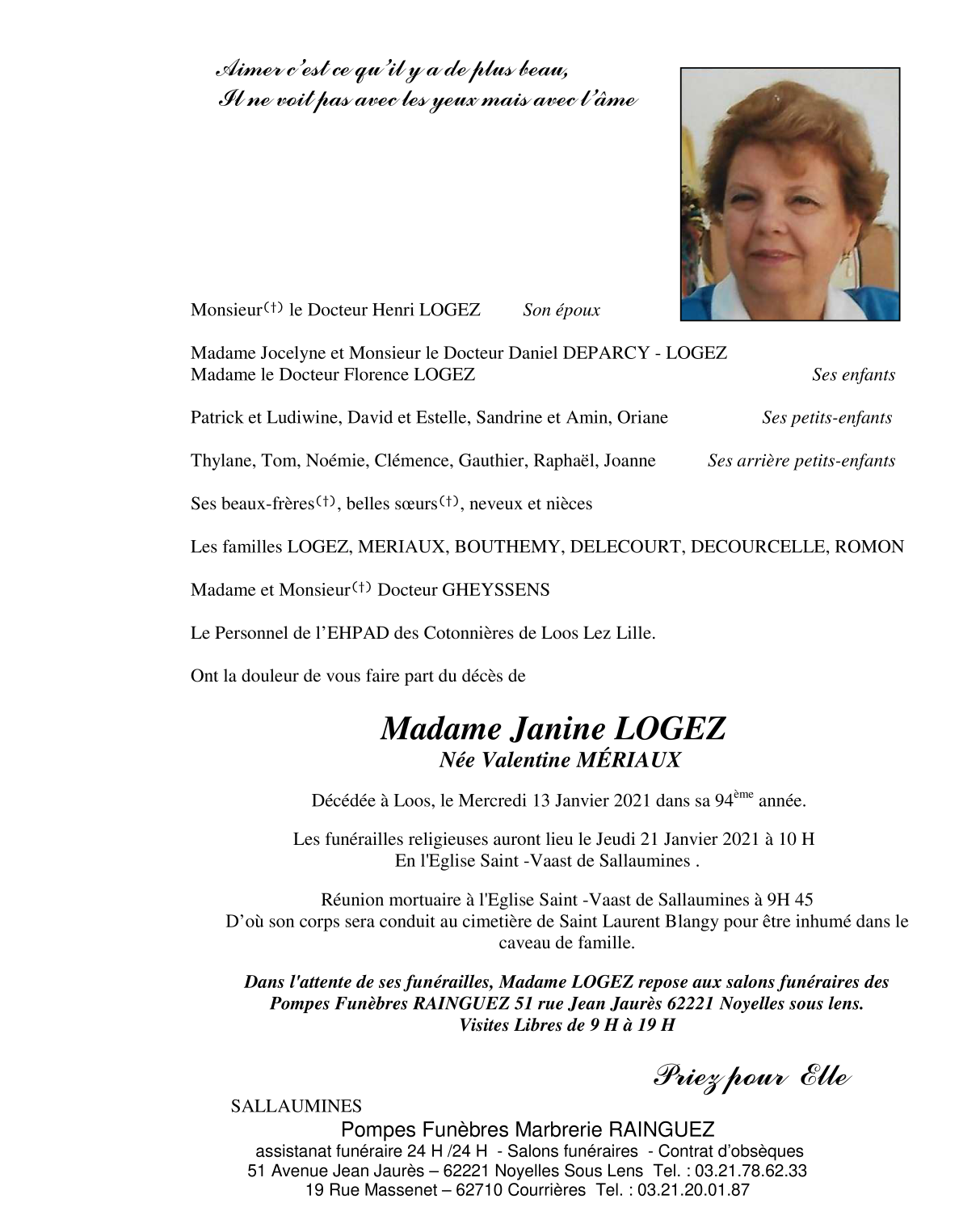 Décédée à Loos (59120, France) le mercredi 13 janvier 2021 à l'âge de 93 ans
