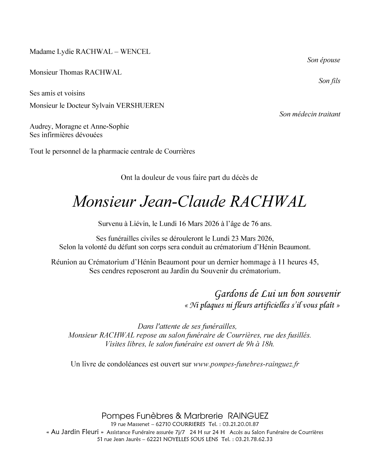 Décédé à Lievin (62800, France) le lundi 16 mars 2026 à l'âge de 76 ans