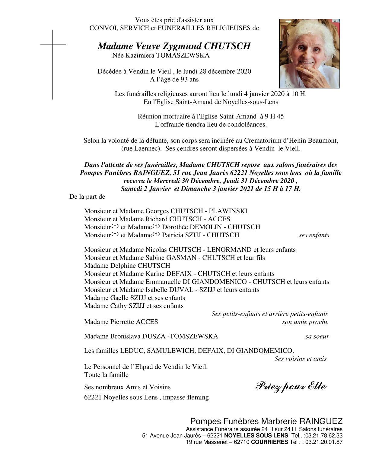 Décédée à Vendin-le-Vieil (62880, France) le lundi 28 décembre 2020 à l'âge de 93 ans