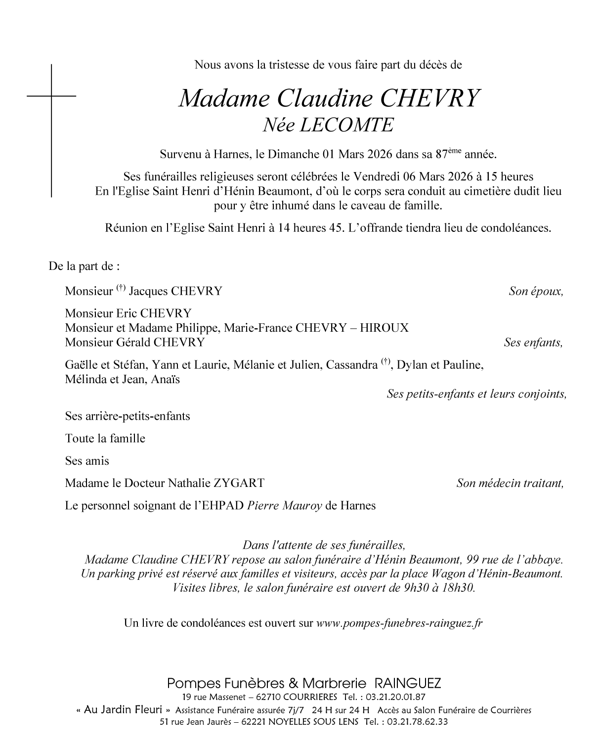 Décédée à Harnes (62440, France) le dimanche 1 mars 2026 à l'âge de 86 ans