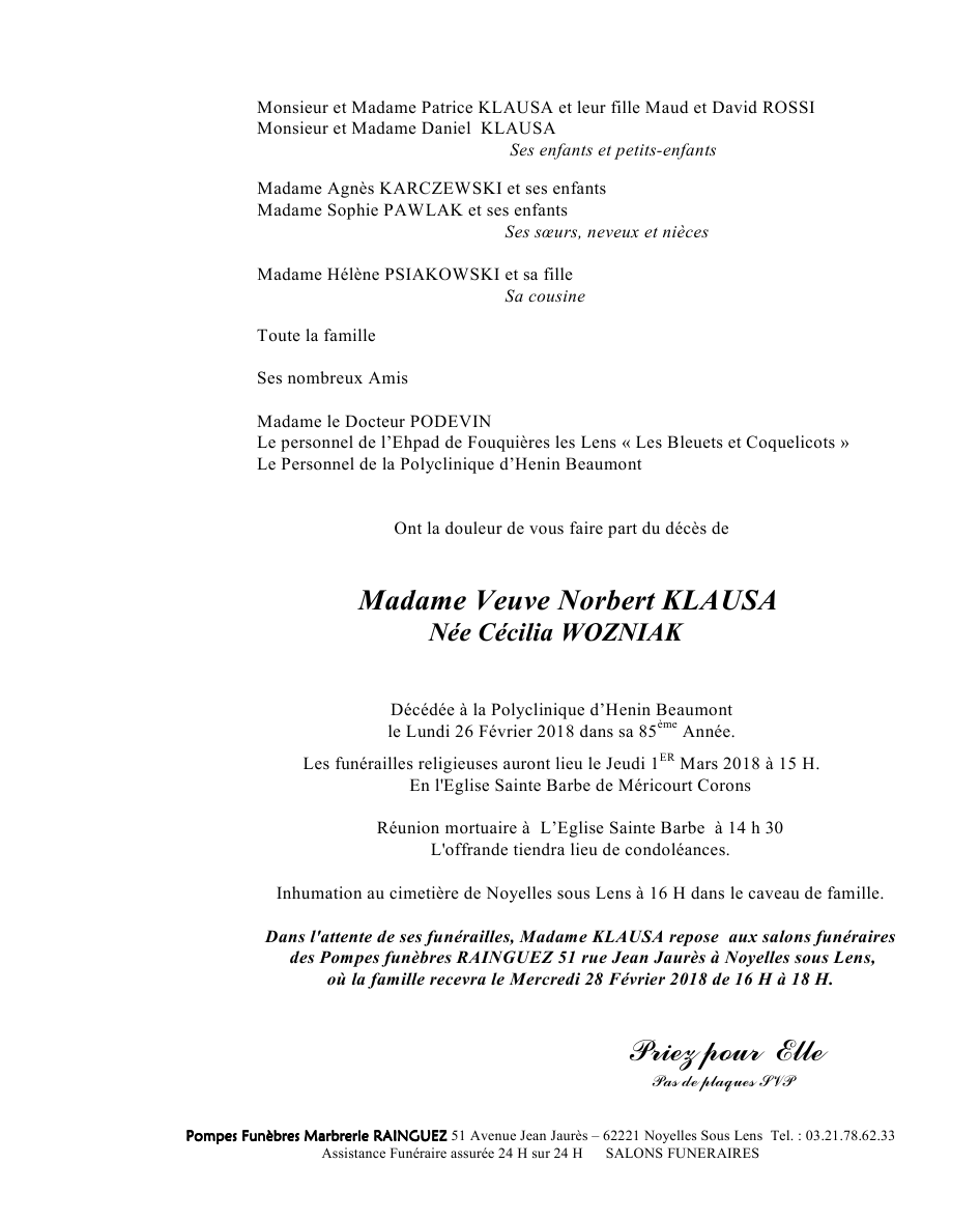 Veuve de Monsieur Norbert KLAUSA