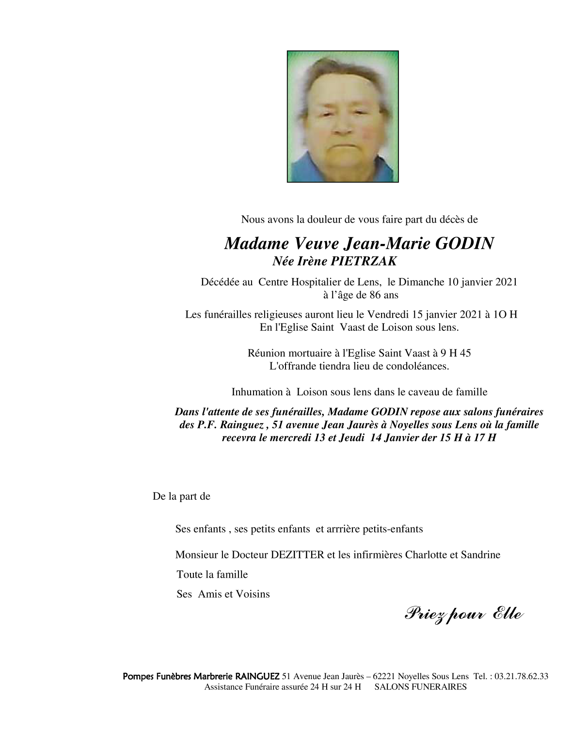 Décédée à Lens (62300, France) le dimanche 10 janvier 2021 à l'âge de 86 ans