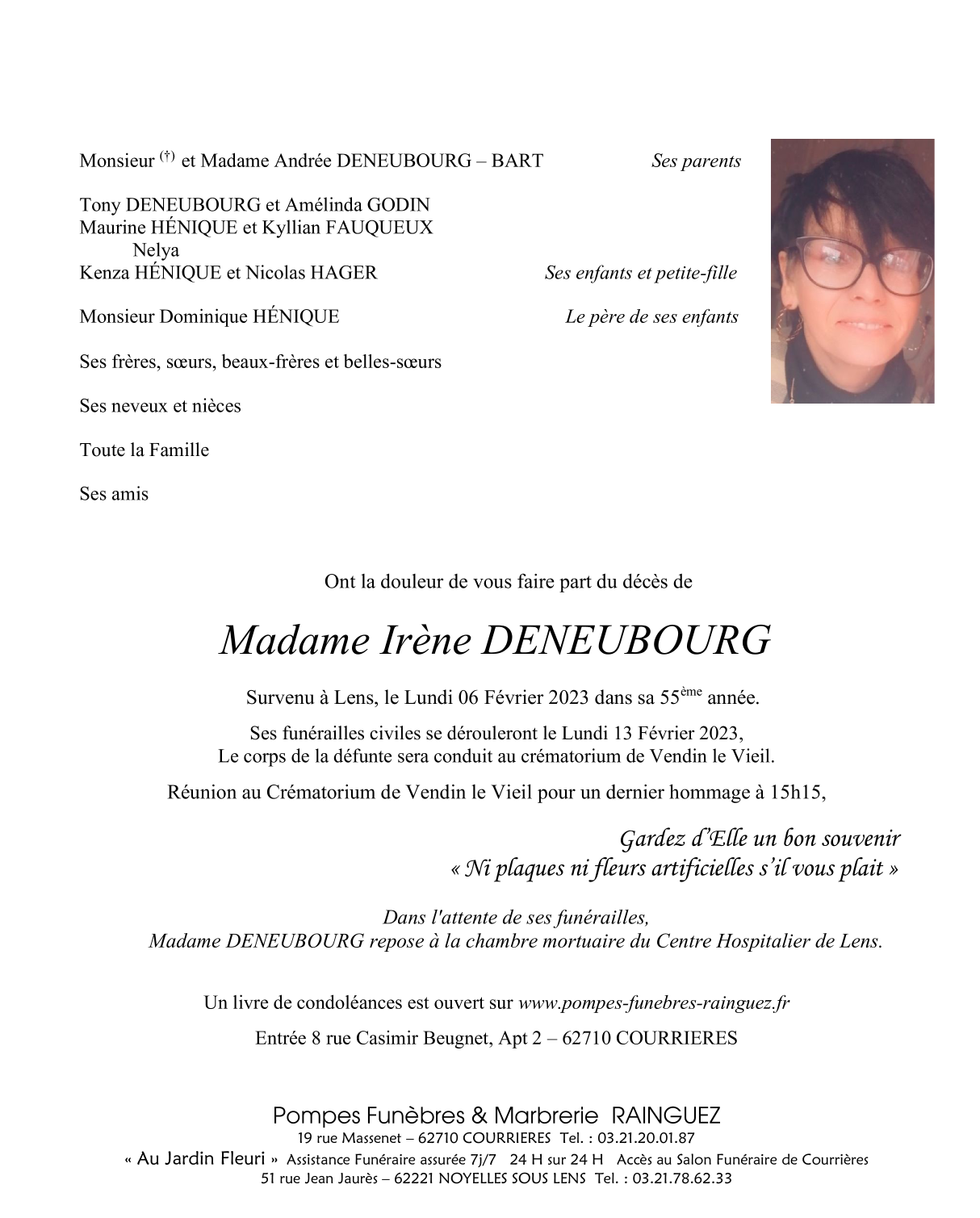 Décédée à Lens (62300, France) le lundi 6 février 2023 à l'âge de 54 ans