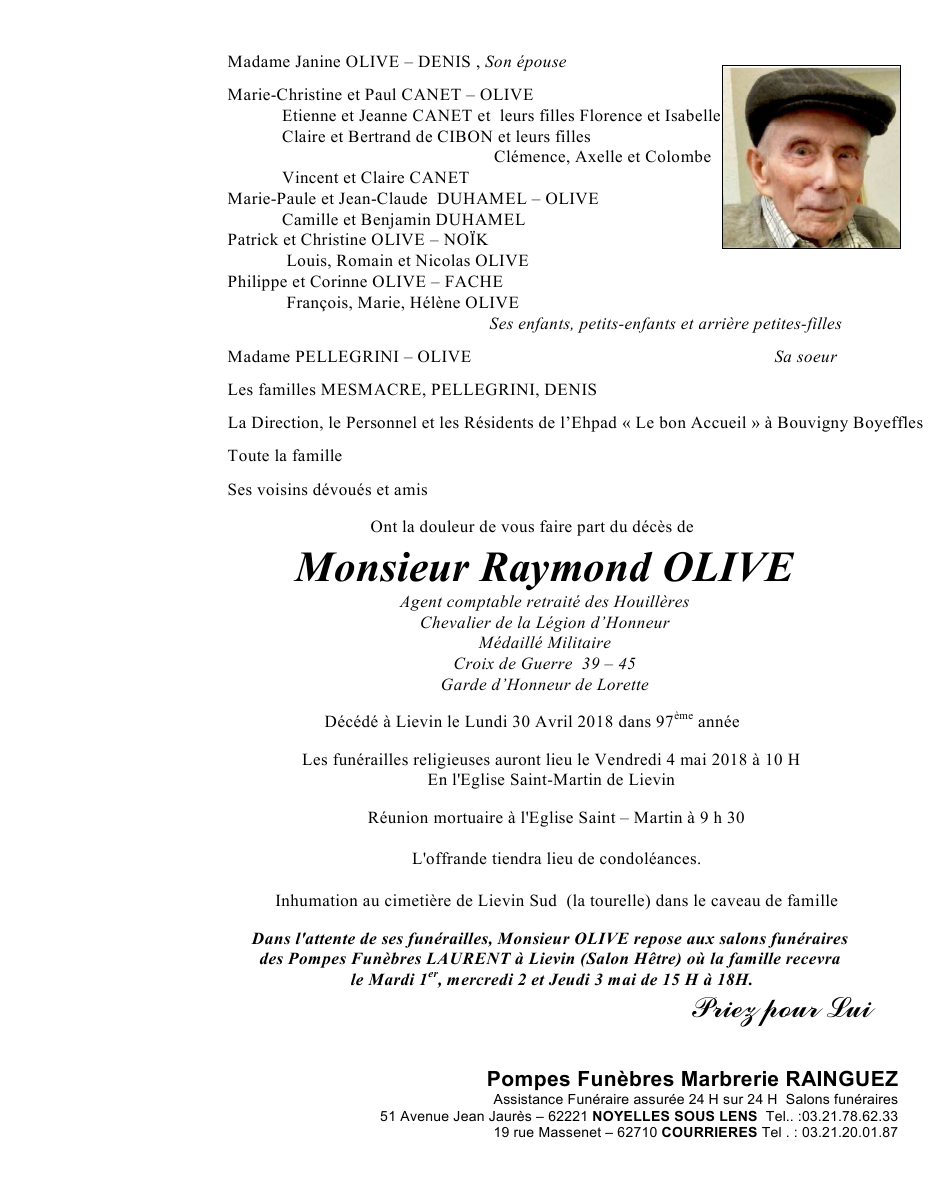 Décédé à Lievin (62800, France) le lundi 30 avril 2018 à l'âge de 96 ans