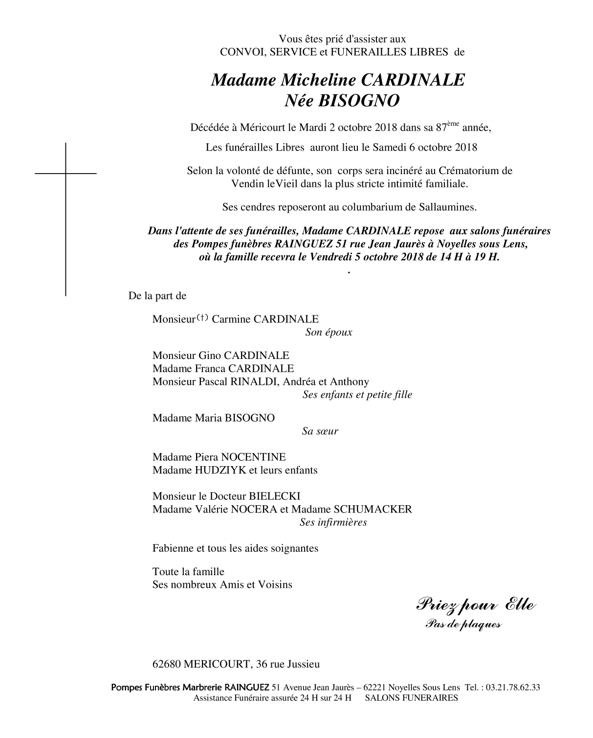 Veuve de Monsieur Carmine CARDINALE
